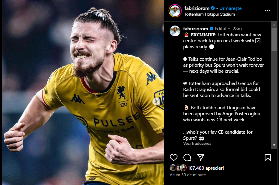 Fabrizio Romano, celebrul jurnalist italian specializat în transferuri, a făcut anunțul bombă după miezul nopții, la scurt timp după ce Drăgușin reușise un gol și o prestație solidă în meciul Genoa – Inter 1-1.